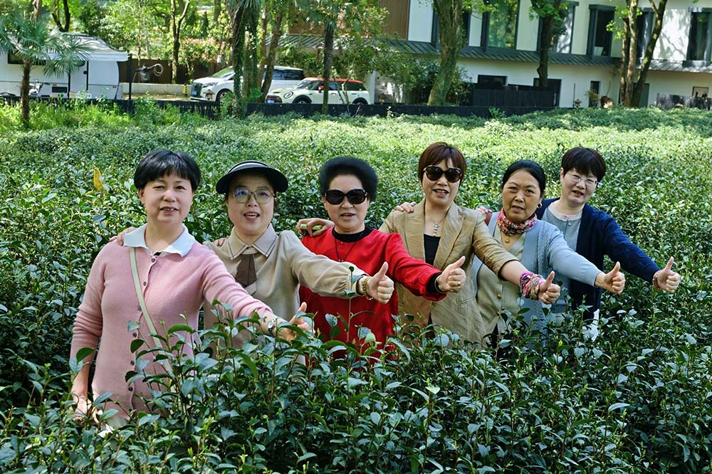 活動首站,我們來到了風景如畫的杭州九溪。這里,一路重巒疊嶂,茶園散處,仿佛是大自然精心布置的一幅幅畫卷。隨著腳步的深入,峰回路轉,流水淳淳,山鳥嚶嚶,每一步都踏在了自然的節奏上,讓人心曠神怡。在這片茶海之中,女企業家、女職工們不僅領略到了杭州西湖龍井茶的種植環境,更在茶香中找到了內心的寧靜與力量,仿佛每一次呼吸都能吸收到自然的靈感與智慧。